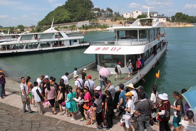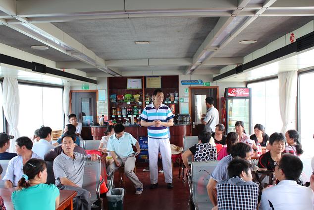 登上沁园07号游船,我们此次千岛湖之旅算是正式开始了。泛舟于“天下第一秀水”,放眼望去,碧波无边,群岛竞秀,真是“千岛碧水画中游”。大家正静静地陶醉在窗外的无边美景当中,忽然间旁边游船上有人钓起来一尾一尺多长的大鱼,让我们兴奋起来,也算见识了这里鱼儿的肥美。