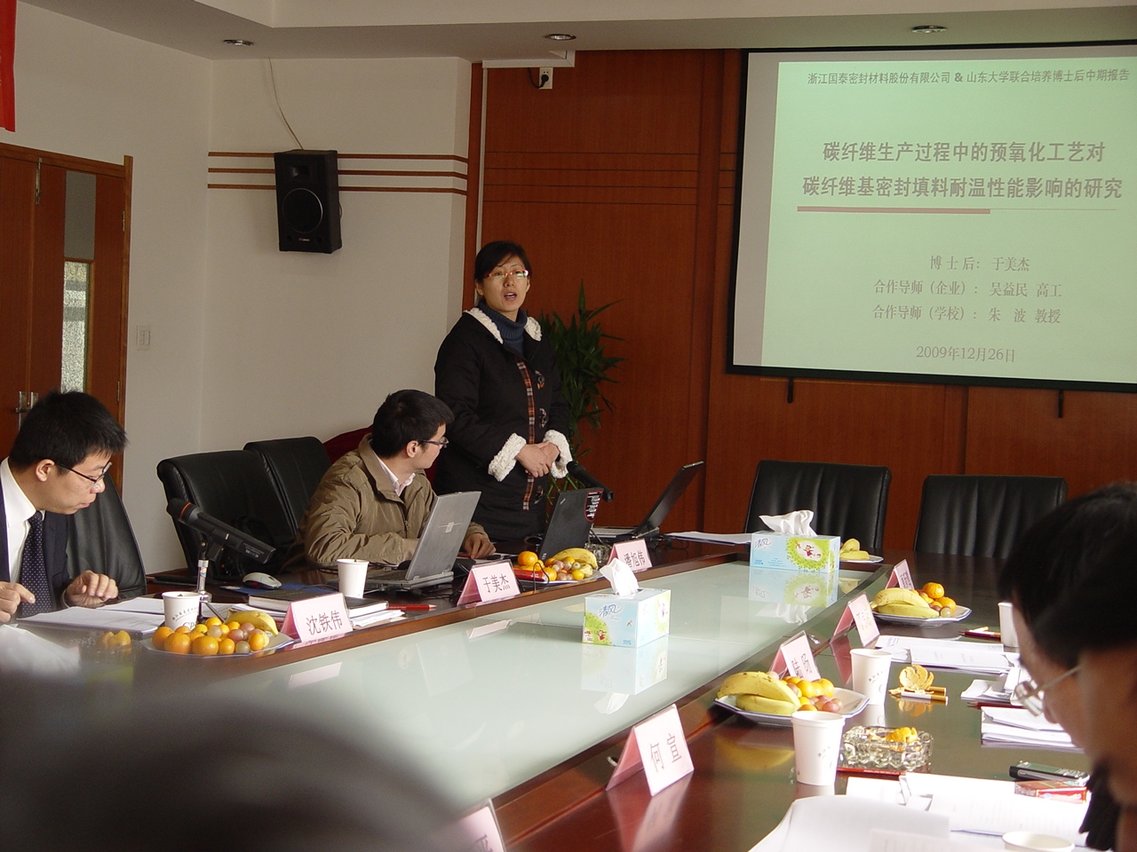会议随后对山东大学博士后于美杰的“碳纤维生产过程中的预氧化工艺对碳纤维基密封填料耐温性能影响的研究”研究课题进行中期考核。