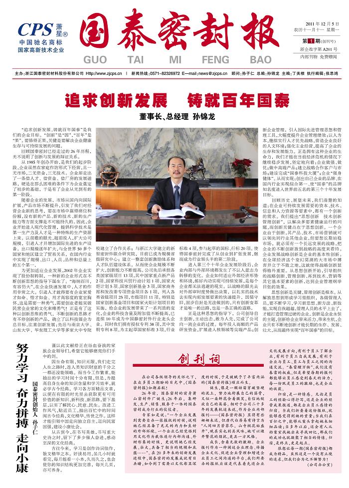 《国泰密封报》的应运而生,是国泰密封为进一步提升公司整体形象的起跑讯号,将作为公司企业文化和企业形象的重要载体,也是内部深度沟通、和谐交流的重要平台,理念思想传播的交流工具。企业报的成功出版得到了公司各级领导和广大员工的大力支持,公司董事长兼总经理孙锦龙撰写了开篇之作《追求创新发展 铸就百年国泰》,勉励大家恪守企业宗旨及经营理念,为了共同的目标而努力奋斗。