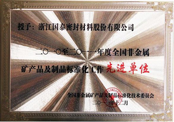 2011年12月17日,“全国非金属矿产品及制品标准化技术委员会”发文授予浙江国泰密封材料股份有限公司等7个单位2010~2011年度标准化工作先进单位称号。同时,发文公布了标准化工作先进个人称号名单,国泰密封常务副总吴益民获此殊荣。