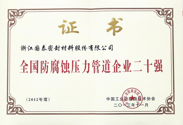 2013年11月6—8日,第五届中国国际腐蚀控制大会于北京召开。大会公布表彰了《2012-2013年中国防腐蚀行业百强榜》入围企业与个人。国泰密封获评“2012-2013全国防腐蚀行业二十强企业”和“全国防腐蚀压力管道二十强企业”殊荣。