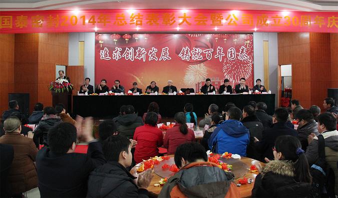 2015年1月28日,国泰密封2014年总结表彰大会暨公司成立30周年庆典在多功能餐厅举行。会上,董事长、总经理孙锦龙做《科技强基 创世界一流密封件企业》的2014年工作报告。会议表彰了2014年先进集体、先进个人和重大创新项目。常务副总、总工程师吴益民主持大会,公司创始人孙子仁和公司领导出席大会并在主席台就坐,全体员工及从全国各地返回的业务员共计700余人参加了会议。