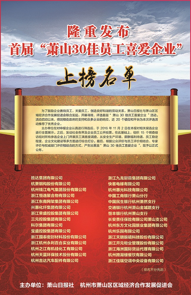 据悉,此次评选通过申报审核、网络投票、员工满意度调查等环节,从安全生产环境、薪酬福利待遇、员工稳定程度、企业文化建设等多方面进行综合打分,最终产生首届“萧山30佳员工喜爱企业”。